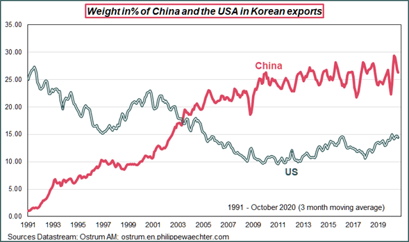 Las negociaciones lideradas por Barack Obama para la TPP tenían como objetivo fortalecer la presencia estadounidense en Asia. De hecho, desde la llegada de China a la Organización Mundial del Comercio, el equilibrio de los países asiáticos se había alterado. La distribución de las exportaciones coreanas a EEUU y China atestigua esto. (El patrón es similar para otros países asiáticos).