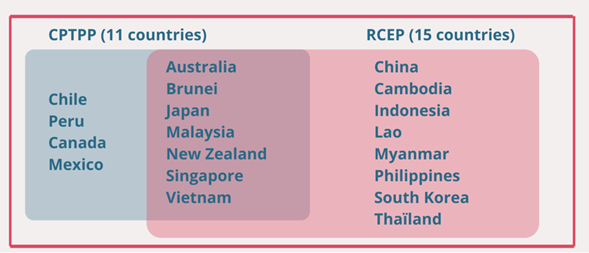 Joe Biden aún no llega a la Oficina Oval y China ya firma un acuerdo de libre comercio (RCEP, o Asociación Económica Integral Regional) con 14 países de Asia y Oceanía. Muchos de ellos ya son parte de la TPP, (renombrada CPTPP, Acuerdo Integral y Progresivo para la Alianza Transpacífica) como se muestra en el gráfico. El tratado de libre comercio es ahora entre Asia y China, y no entre Asia y Estados Unidos.