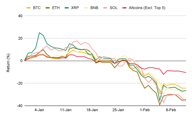 Desempeño indexado acumulado en el año, principales activos digitales. Fuente: TradingView, Binance Research, 12 de febrero de 2026