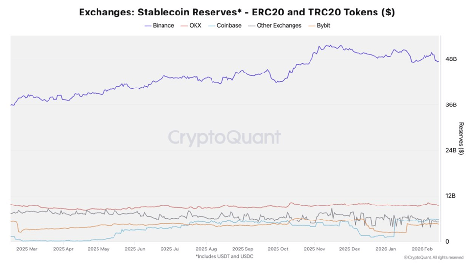 Latam, febrero de 2026.– Binance ha reforzado su posición como el principal lugar para la asignación de capital en el mercado de criptomonedas al concentrar más del 65% de las reservas de stablecoins (USDT y USDC) — criptomonedas estables respaldadas por monedas como el dólar — mantenidas en exchanges centralizados, lo que equivale a 47,5 mil millones de dólares dentro del sector, según datos de la plataforma de análisis on-chain CryptoQuant.